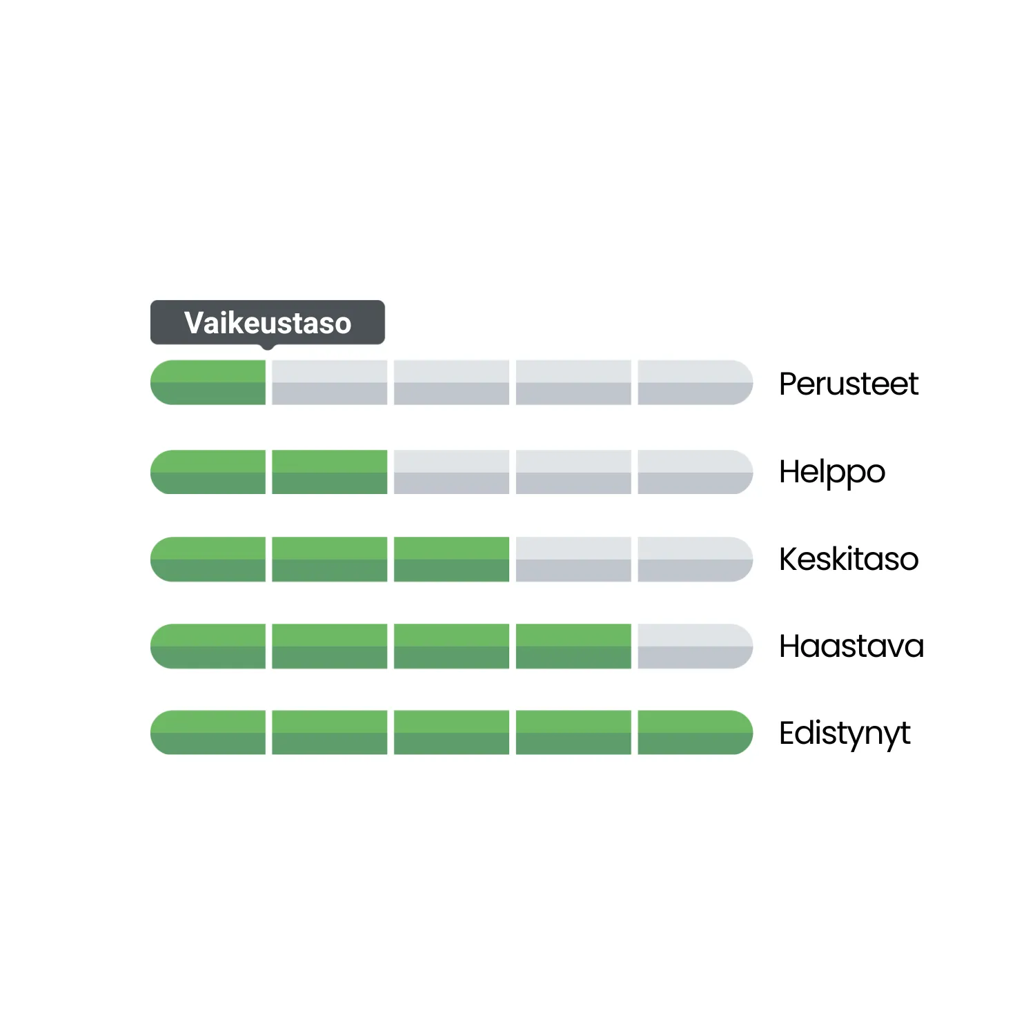 Jotta oikean oppaan löytäminen olisi mahdollisimman helppoa, olemme tehneet oppaiden vaativuustason selkeästi näkyväksi. Käytämme viisiportaista asteikkoa, jota kutsumme vaikeustasoiksi.